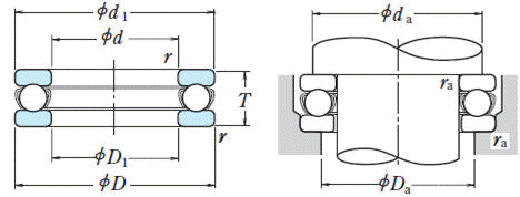 | d (내경) | D | T | r min | Basic Load Ratings (kN) | Limiting Speeds (rpm) | 호칭번호 | d1 | D1 | da min | Da max | ra max | 중량 (kg) |