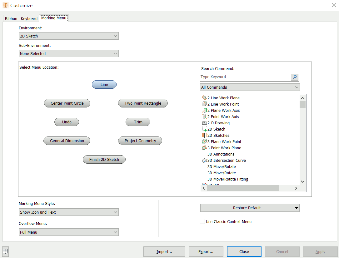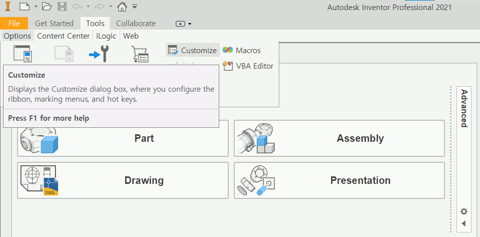 1. 인벤터 > Tool(도구) > Customize(사용자화)