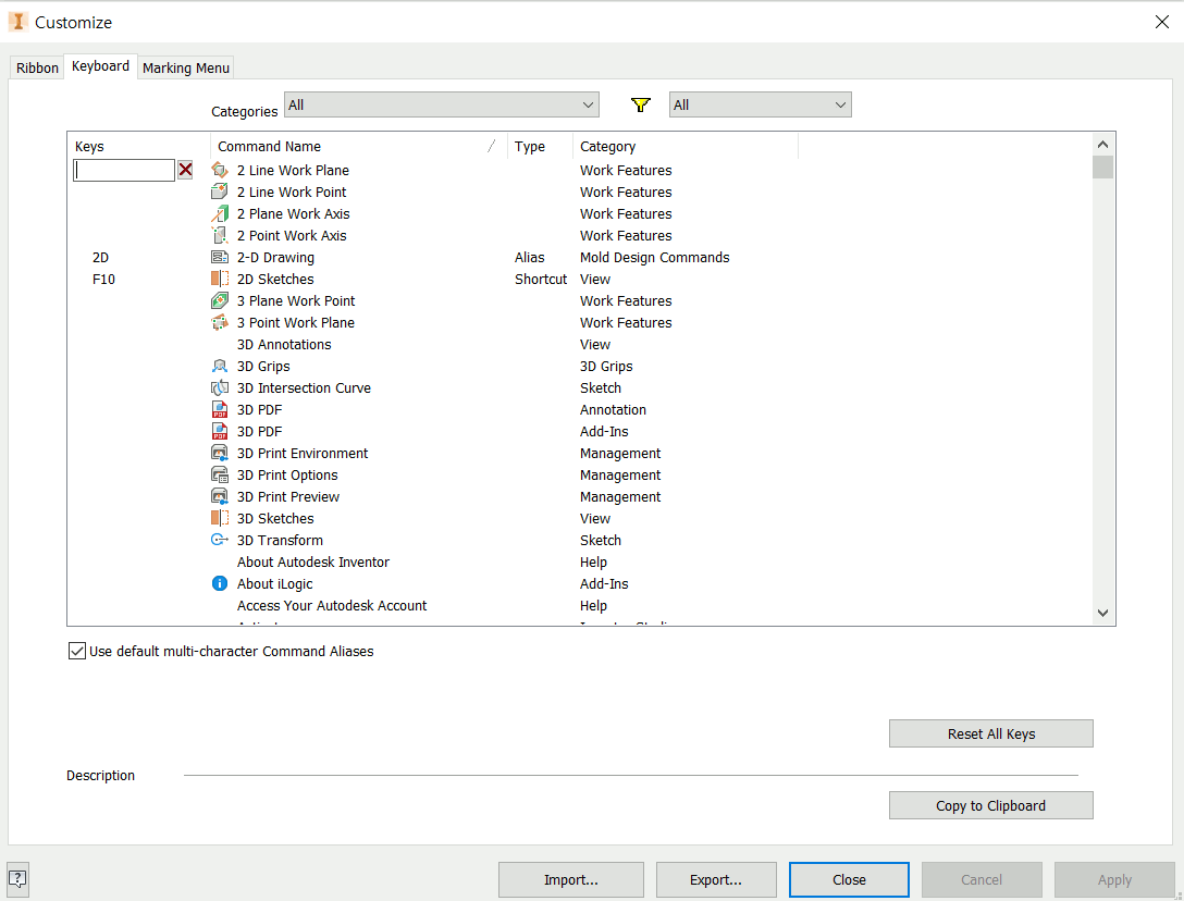 2. Ribbon 말고 Keyboard를 확인하면 keys는 단축키, command name은 하고자하는 작업 이름, category는 작업시 들어가있는 카테고리로 빈칸 혹은 이름이 써있는 곳을 더블클릭하면 단축키, 이름, 카테고리 변경 가능.