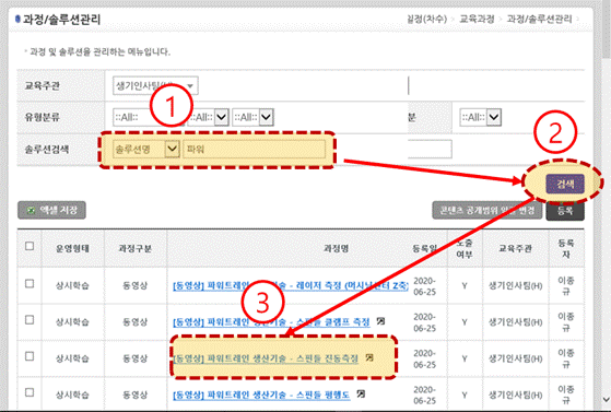 ⇨ ③ 해당 과정 명을 클릭하면 '과정/솔루션관리' 화면으로 전환된다.