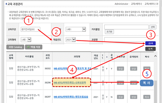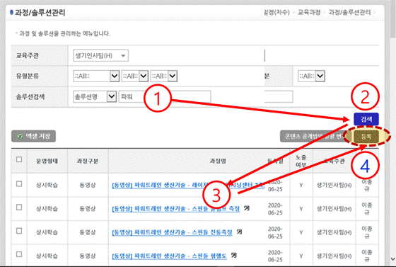 ⇨ ③ 해당 과정 명을 확인 후, 등록된 과정이 없으면 ④ [ 등록 ] 버튼을 클릭한다.