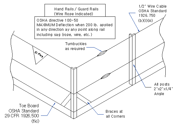 윗 난간의 최소 높이는, 지지대 중간에서 아래로 적용되는 힘 (Downward Force)가 200 파운드로, 반드시 39 인치가 되어야 한다.