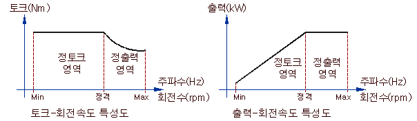 Inverter를 부착하여 정토크 영역(주파수를 낮게 설정)에서 사용할 경우 출력이 감소함으로 주의 요망.