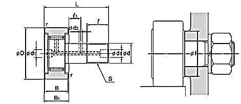 | 스터드경 d | 외경 D | 나사 S | 외륜폭 B | B1 | 전장 L | d1 | d2 | ℓ | ℓ1 | r | 어깨치수 f (최소) | |