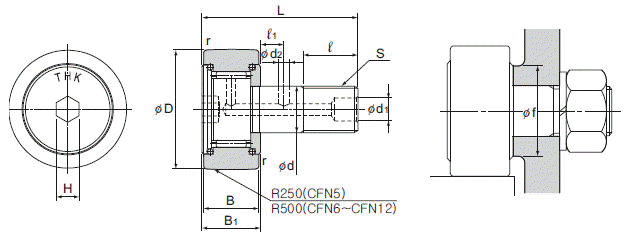| 스터드경 d | 외경 D | 나사 S | 외륜폭 B | B1 | 전장 L | d1 | d2 | ℓ1 | H | r | 어깨치수 f(최소) | |
